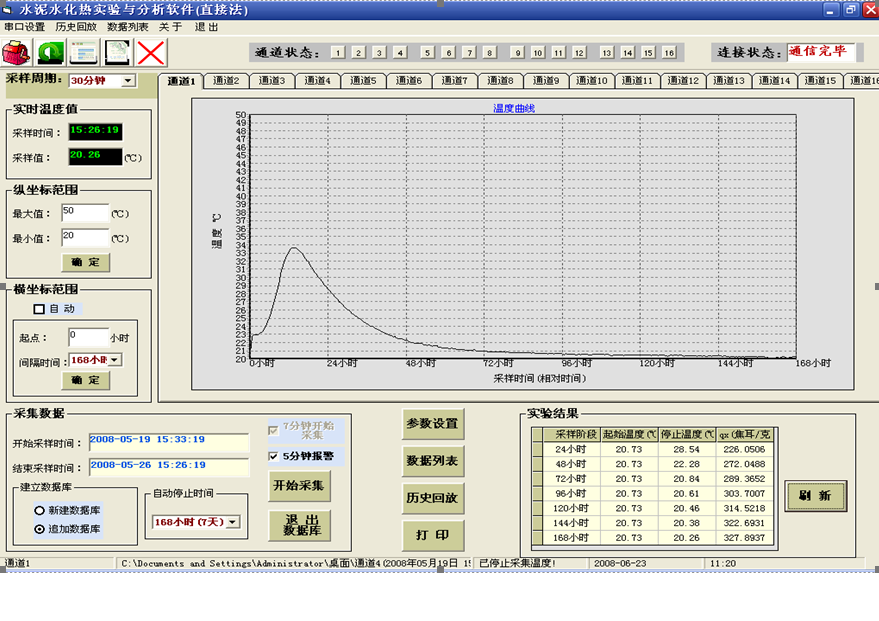 可進(jin)行試驗參數(shù)設定,設置自(zi)動采集/停止(zhi)/記錄/分析/計(ji)算,實時顯示(shi)每通道放熱(re)曲線,進行1~7天(tiān)水合熱計算(suan)并生成測試(shi)報💔告。界面簡(jian)潔友好,16個通(tōng)道獨立運行(háng),用顔色指示(shì)每通道的實(shí)時采集狀态(tai),并設有數據(ju)追加/回放等(deng)功能,數據庫(kù)文件可導入(rù)EXECL文件做進一(yī)步分析。